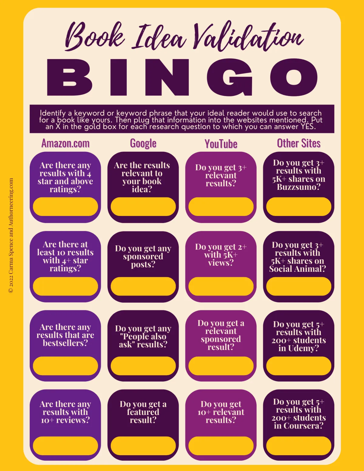 Enter your information below to not only receive the Book Idea Validation Bingo Card but also join Carma's email list to receive the weekly Author's Vision newsletter and other informative messages to help you on your Author's Journey. You can unsubscribe at any time.